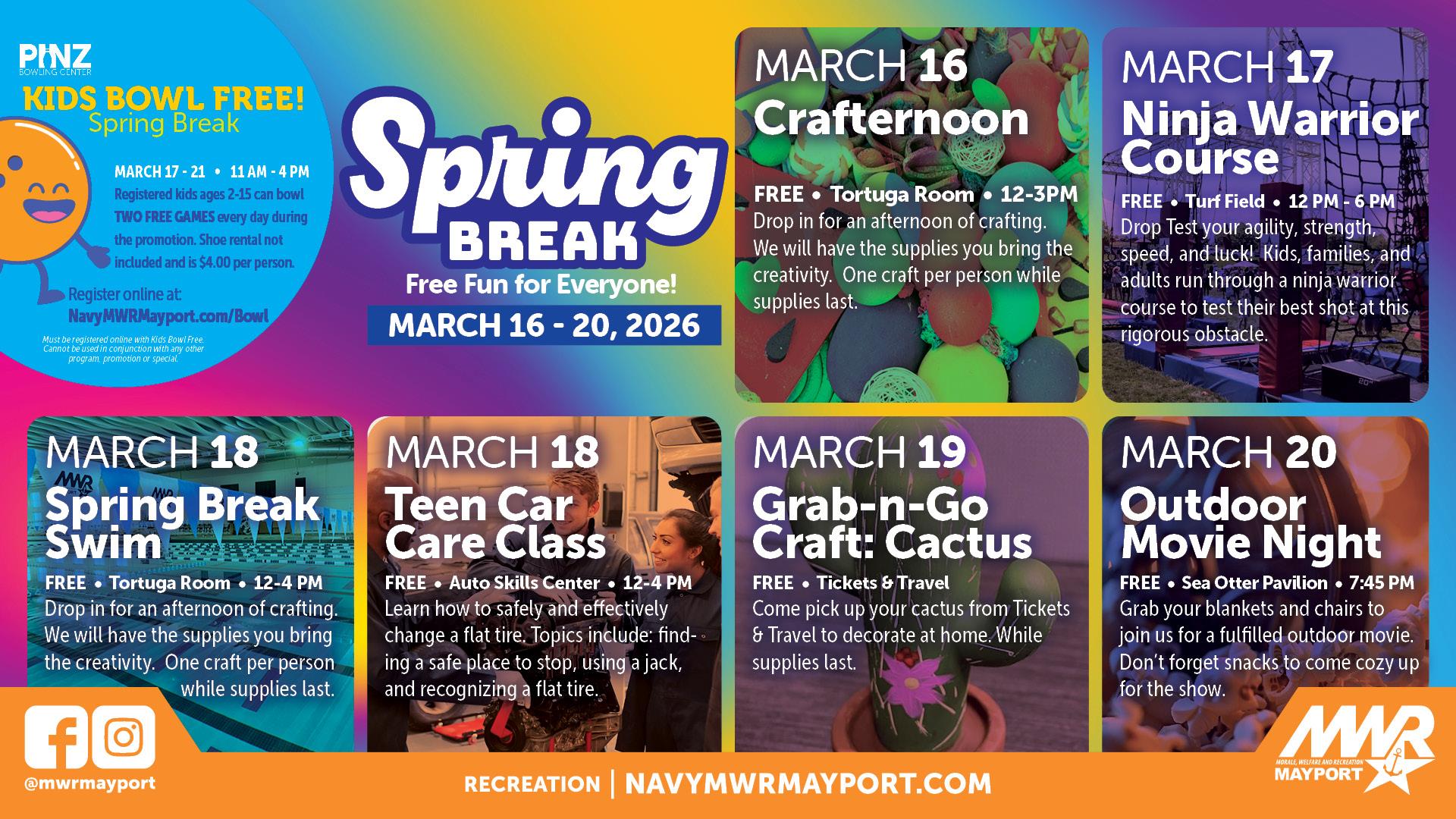 - MAR 17 through MAR 21 Kids Bowl Free 11 AM to 4 PM at Pinz Bowling Center. Kids ages 2–15 get two free games each day. Sign up at NavyMWRMayport.com/Bowl. FREE.
